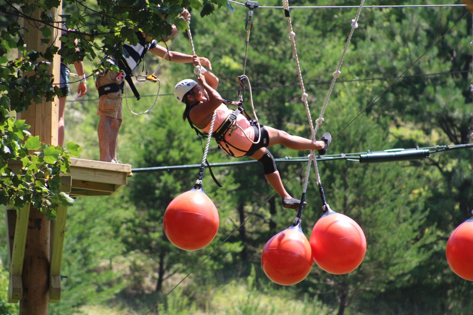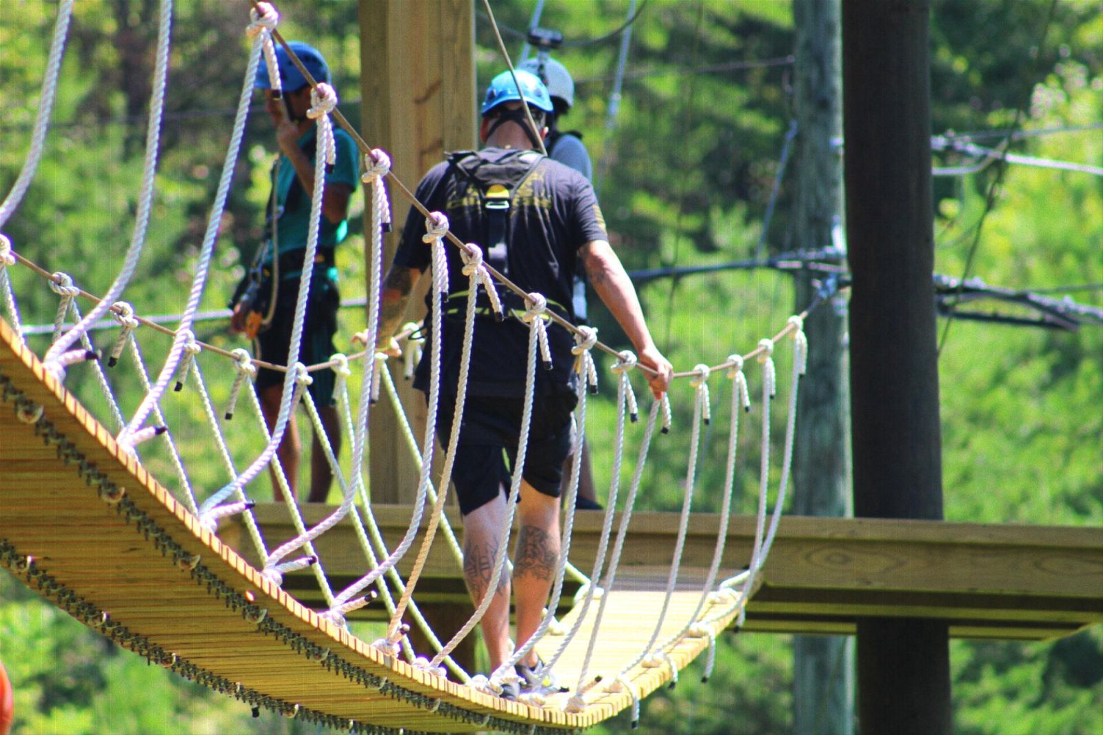 Our extreme course has 13 elements that go across the Chattahoochee River and a zipline. The elements include: Flea Hop, Giant’s Necklace, Swinging Stairs, Pirate’s Net climb, Balance Beam, Indiana Jones Bridge, Bouncy Buoys, Zig Zag, Stump Step, Horizontal Playpen, Swinging Ladders, Tension Traverse, Ring Swing. Several elements are suspended over the Chattahoochee River. You will end the course on the zipline.